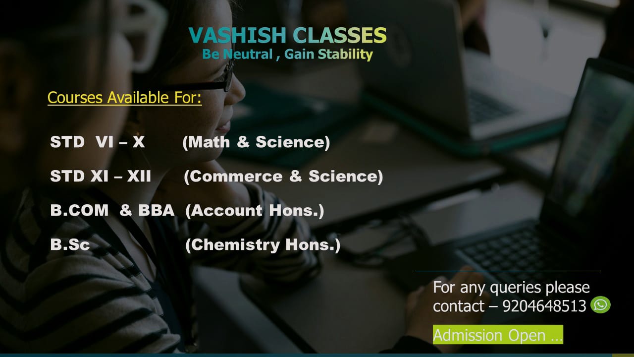 It is a great pleasure for Vashish Classes that has created a Website successfully by all Students, Friends and Relative supports. Our classes always focus on high quality early childhood education is to the future of the children and our country. During this pandemic , it will be a great challange for the students , but they had given a Excellent Result in their board exam. Vashish classes has completed 5 years of successful journey , with a lots of ups and downs. But due to all circumstances our main focus is on students result. During this 5 year journey students have shown their hard work and talent through their result. After show many request - Vashish classes have decided to start a online classes in youtube and Facebook. It will a great learning platform for students.🙏 Thanks,